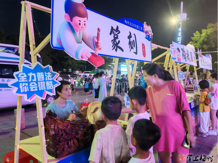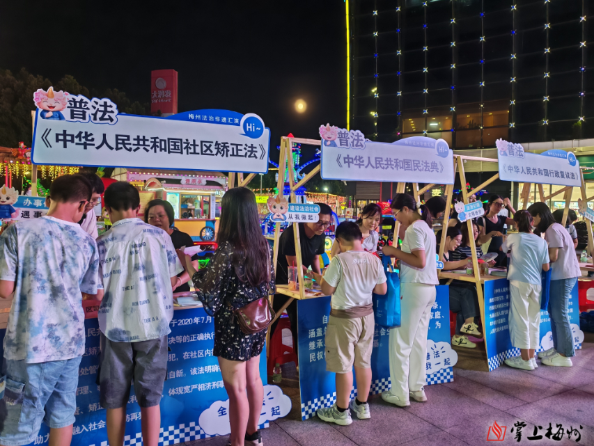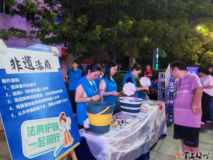 表演期间穿插着有奖问答环节,观众踊跃参与,在轻松愉悦的氛围中学习《中华人民共和国民法典》《中华人民共和国社区矫正法》《中华人民共和国人民调解法》《梅州市人民调解工作规定》等法律法规知识。此外,观众还在舞台周围的拍照打卡区、普法宣传区、普法游戏区、非遗手工制作体验区等区域参与互动。市民黄先生专门带孩子来参加活动,他表示,此次活动内容丰富多彩,大家可一边感受文化之美,一边接受法治熏陶,受益良多。
